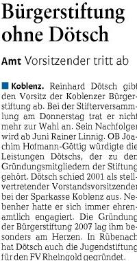(Koblenz: 20.04.12) Reinhard Dötsch gibt den Vorsitz der Koblenzer Bürgerstiftung ab. Bei der gestern tagenden Stifterversammlung trat Dötsch nicht mehr zur Wahl an. Sein Nachfolger wird im Juni Rainer Linnig.