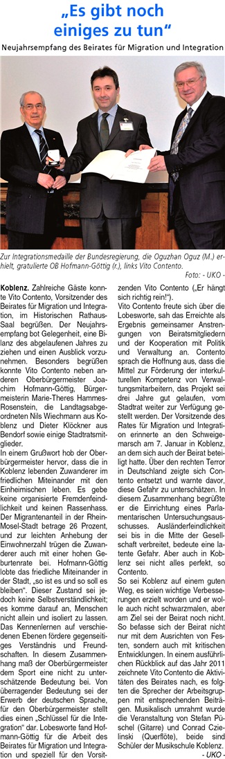 Der Oberbürgermeister (Mitte) übergab Oguzhan Oguz (links), er ist Mitglied des Koblenzer Beirates für Migration und Integration, symbolisch die Integrationsmedaille der Bundesregierung, die ihm bereits im November 2011 von der Integrationsbeauftragten der Bundesregierung Maria Böhmer verliehen wurde.