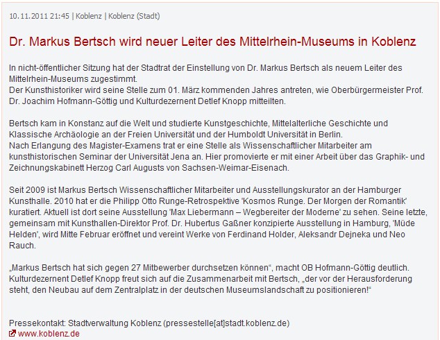 (Koblenz: 10.11.11) In nicht-öffentlicher Sitzung hat der Stadtrat der Einstellung von Dr. Markus Bertsch als neuem Leiter des Mittelrhein-Museums zugestimmt.