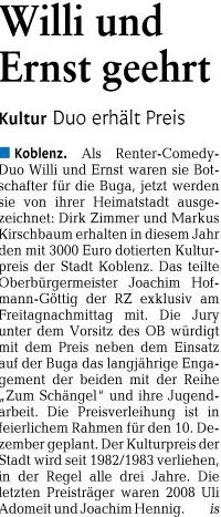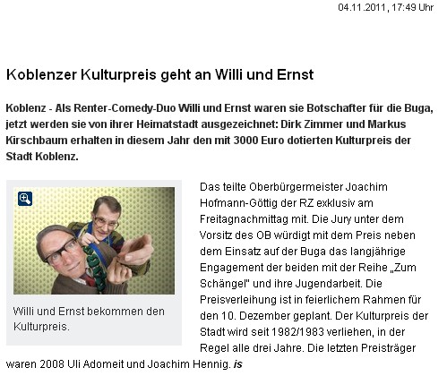 (Koblenz: 07.11.11) Mit dem Kulturpreis der Stadt Koblenz sollen Menschen für besondere schöpferische Leistungen auf dem Gebiet der Wissenschaft oder Kunst ausgezeichnet werden. „Die beiden diesjährigen Preisträger sind besonders gute Beispiele für schöpferische Leistungen: Sie erfanden und verkörpern die Figuren Willi Naumann und Ernst Schneider“, beschreibt Oberbürgermeister Prof. Dr. Joachim Hofmann-Göttig die Wahl der Jury.