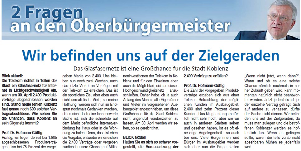 Schon vor Eintritt in die Tagesordnung konnte der OB verkünden, dass die Telekom in Koblenz ein Glasfasernetz aufbauen wird, das bis in die Häuser der Endverbraucher reicht. Damit wird Koblenz an das zukunftssichere Netz angeschlossen. Die Stadt selbst flankiert diesen Ausbau mit 2 Millionen Euro. Denn die Telekom wird für die Verlegung rund 60 km Gräben ausheben – fast ausschließlich in Gehwegen. Die restlichen Gehwegflächen neben den Gräben wird die Stadt erneuern lassen, sofern es sich um Gehwege aus Platten oder Asphalt handelt.