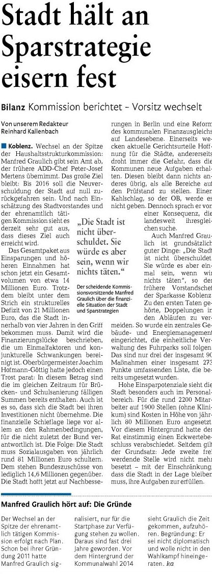 - Bilanz und Aussicht der vom Stadtrat eingesetzten Haushaltsstrukturkommission mit Wechsel an der Spitze, da der nun zwei Jahre ehrenamtlich tätige Ex-Koblenzer Sparkassenchef Graulich diese Arbeitsbelastung nicht mehr länger auf sich nehmen möchte