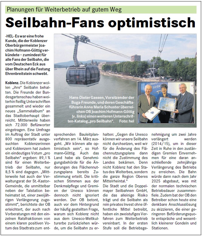 - Zur Koblenzer Seilbahn: Stadtrat wird über 2-jährige Verlängerung des Seilbahnbetriebs abstimmen mit dem Ziel einer ggf. 10-jährigen Verlängerung mit möglicher Anschlusslösung unter Berücksichtigung und in Abstimmung mit der Denkmalspflege und der UNESCO, da 90% der Koblenzer Bevölkerung “Pro Seilbahnverbleib” sind