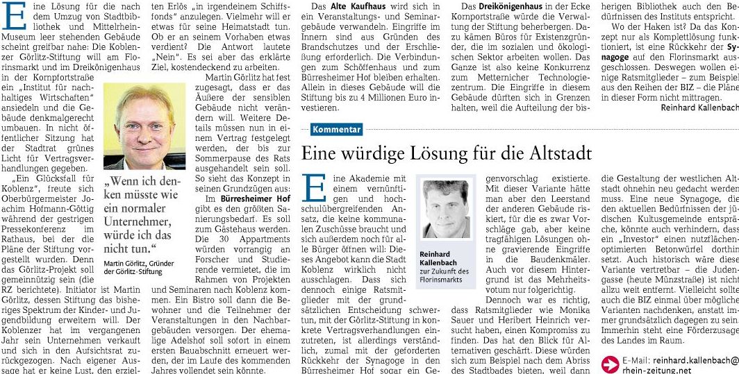 Durch den Umzug des Mittelrhein-Museums und der Stadtbibliothek in das auf dem Zentralplatz neu errichtete Kulturgebäude „Forum Confluentes“, werden im Laufe des Jahres 2013 die städtischen Altstadtimmobilien Bürresheimer Hof, Mittelrhein-Museum (Altes Kauf- und Danzhaus) und Dreikönigenhaus frei. Da eine Sanierung und Weiternutzung durch die Stadt selbst ausschied, wurde bereits Ende des Jahres 2011 ein öffentliches Interessensbekundungsverfahren durchgeführt. Nach intensiver Auswertung der eingegangenen Nachnutzungskonzepte wurde die Verwaltung nun durch den Stadtrat beauftragt, in konkrete Kaufvertragsverhandlungen mit der GÖRLITZ Stiftung zu treten. Deren Planung sieht eine Nachnutzung gleich aller drei in Frage stehender Gebäude vor.