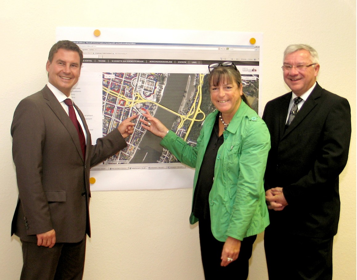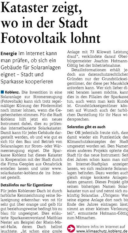 „Wo sinnvolle Investitionsmöglichkeiten bestehen, wollen wir mit günstigen Finanzierungsangeboten zur Umsetzung beitragen.“ erklärt Sparkassenvorstand Matthias Nester bei der Inbetriebnahme im Büro von Oberbürgermeister Prof. Dr. Joachim Hofmann-Göttig. Für jedes Koblenzer Dach ist durch farbliche Kennzeichnung seine Solareignung erkennbar; von rot für sehr gut über orange und gelb für gut bzw. bedingt bis zu blau für ungeeignet. Dies erläuterte Nester am Beispiel der Rhein-Mosel-Halle, deren Dach hellrot leuchtete. „Ist schon eine große Anlage mit 73 Kilowatt Leistung drauf!“ verkündete darauf der OB.