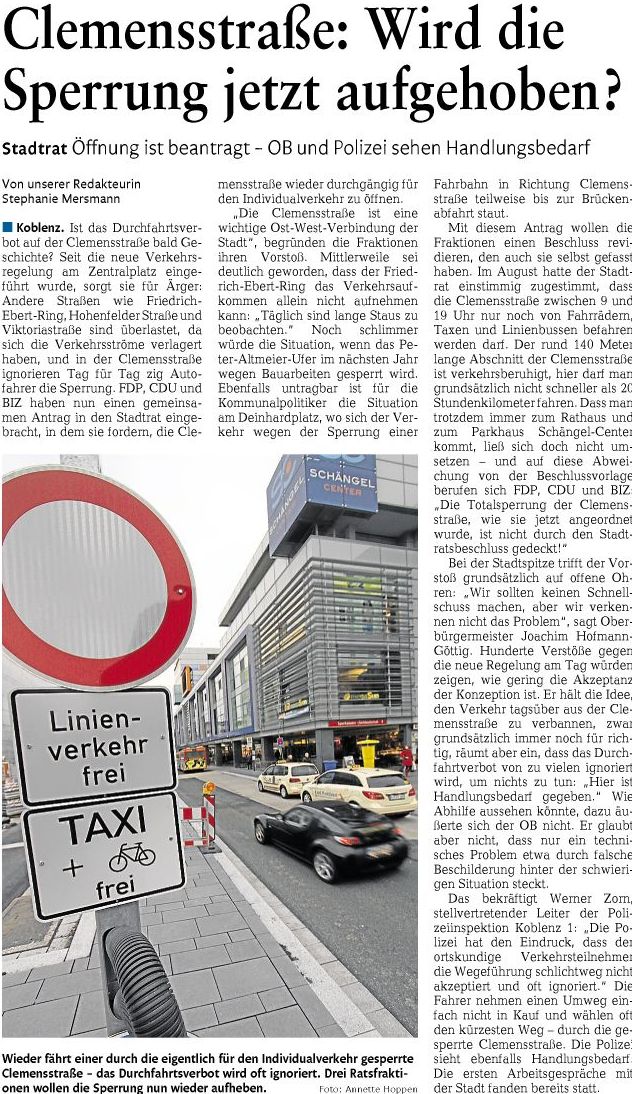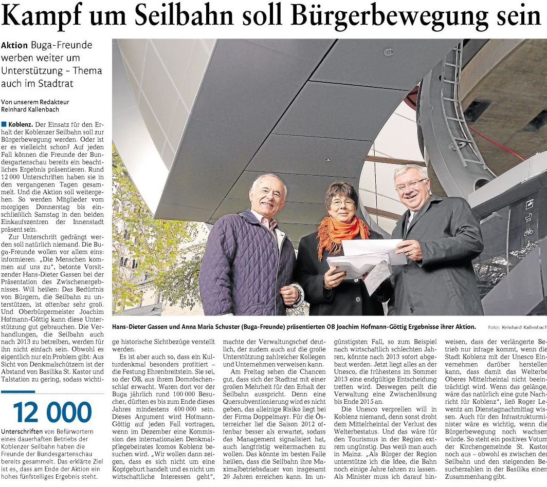 Mit Kurzinterview von OB Hofmann-Göttig auch zum bevorstehenden Unterstützungsbeschluss des Koblenzer Stadtrats am 09.11.2012