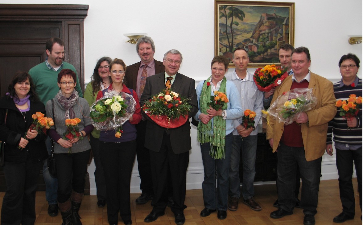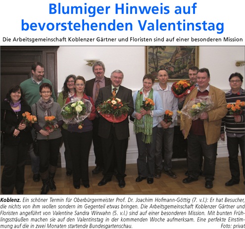 Ein schöner Termin für Oberbürgermeister Prof. Dr. Joachim Hofmann-Göttig (7. v.l.): Er hat Besucher, die nichts von ihm wollen sondern im Gegenteil etwas bringen. Die Arbeitsgemeinschaft Koblenzer Gärtner und Floristen angeführt von Valentine Sandra Wirwahn (5. v.l.) sind auf einer besonderen Mission. Mit bunten Frühlingssträußen machen sie auf den Valentinstag in der kommenden Woche aufmerksam. Eine perfekte Einstimmung auf die in zwei Monaten startende Bundesgartenschau.