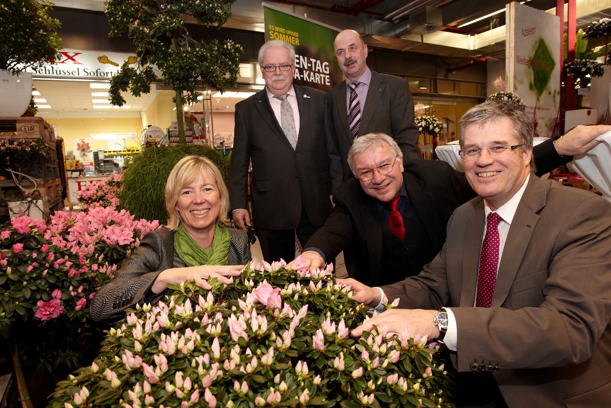 Foto: BUGA Koblenz 2011 GmbH/Frey. Von links: Kultusministerin Doris Ahnen, Matthias Melchisedech (Vizepräsident Gartenbauverband RLP), Volker Schmitt (Präsident Gartenbauverband RLP), OB Prof. Dr. Joachim Hofmann-Göttig und BUGA-Geschäftsführer Hanspeter Faas