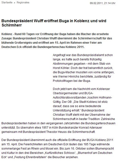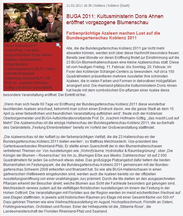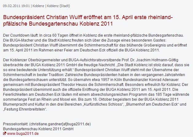 Auszug aus dem Wortlaut Pressemitteilung der Bundesgartenschau Koblenz 2011 GmbH, Koblenz 09.02.2011: