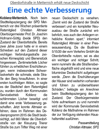 Auszug: Wortlaut und Foto der Pressemeldung der Stadt Koblenz, 09.07.2015
