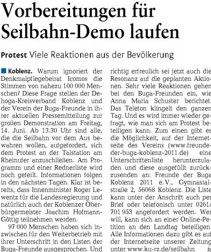 Wenn dann – mit allen guten Wünschen und vielen Argumenten ausgestattet – Kulturstaatssekretär Walter Schumacher nach Kambodscha reist, wollen die Koblenzer nicht untätig sein. So wird, veranstaltet vom Hotel- und Gaststättenverband und den „Freunden der BUGA“, unterstützt durch die Rhein-Zeitung, am Freitag, 14. Juni, um 13:30 Uhr, an der Talstation, eine Demonstration für den Erhalt der Seilbahn stattfinden. Der OB ruft alle Bürgerinnen und Bürger aus Stadt und Region auf, sich dieser Demonstration anzuschließen. „97.000 Unterschriften für die Seilbahn, eine 90 prozentige Zustimmung der Bevölkerung zur Seilbahn und ein einstimmiges Votum des Koblenzer Stadtrates kann man nicht einfach ignorieren. Die Seilbahn muss bleiben – zusammen mit dem Welterbetitel!“, so Hofmann-Göttig, „je mehr Menschen den Platz vor der Talstation bevölkern, umso eindrucksvoller wird unser Signal zur Unesco sein.“ Der Oberbürgermeister wird selbst auch zu den Rednern der Demonstration gehören. “
