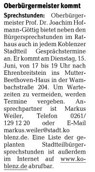 10.06.2010: Koblenzer OB Stadtteil-Sprechstunden in “Güls” und “Rübenach”