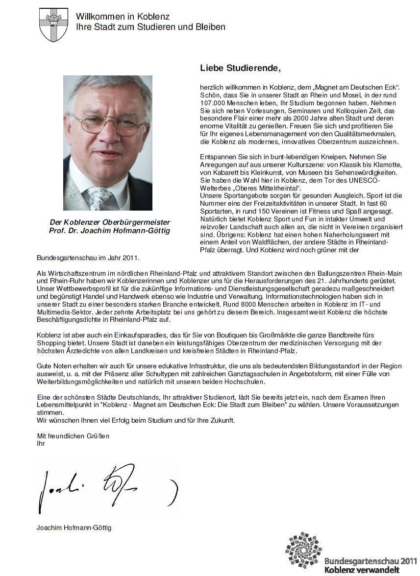 Grußwort von OB Hofmann-Göttig an die Studierenden in Koblenz, Studierendeninformationsfaltblatt des Bürgeramts der Stadt Koblenz 2011