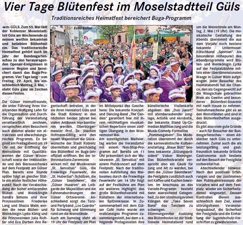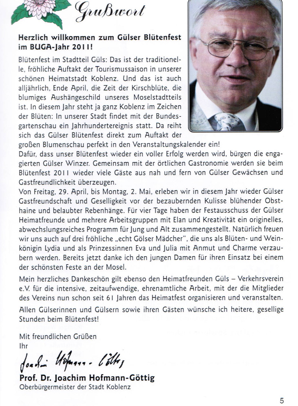 Grußwort von OB Hofmann-Göttig zum Blütenfest 2011 (29.04. bis 02.05.2011) des Koblenzer Stadtteils Güls in der Festbroschüre der Heimatfreunde, April 2011, S.5