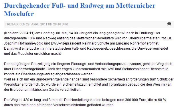 (Koblenz: 29.04.11) Am Sonntag, 08. Mai, 14.00 Uhr geht ein lang gehegter Wunsch in Erfüllung: Der durchgehende Fuß- und Radweg entlang des Metternicher Moselufers wird von Oberbürgermeister Prof. Dr. Joachim Hofmann-Göttig und BWB-Vizepräsident Reinhard Schütte am Eingang Rohrerhof eröffnet.