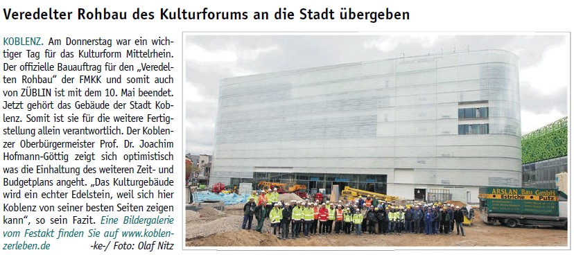 (Koblenz: 10.05.12) Heute wurde der Kulturbau am Zentralplatz als veredelter Rohbau der Stadt Koblenz übergeben. In einer Feierstunde würdigt Oberbürgermeister Prof. Dr. Joachim Hofmann-Göttig die bisher geleistete Arbeit und dankte allen Beteiligten für ihren nicht immer leichten Einsatz.