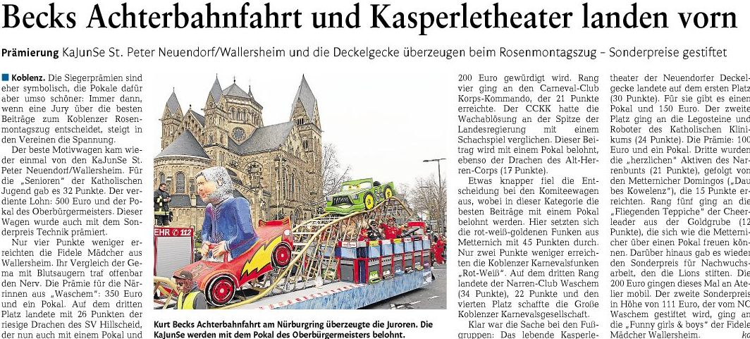 Beim Rosenmontagszug bin ich auf dem Motivwagen des von uns sehr geschätzten Bundeswehr „Carneval Club Korpskommando Koblenz“ (CCKK) zusammen mit dem Bundeswehrstandortältesten Dr. Claus-Michael Lommer und dem CCKK-Vorsitzenden Peter Olf dabei. Wir haben viel Spaß zusammen auf dem Wagen mit den gut 100.000 Zugbesucherinnen und -besuchern.
