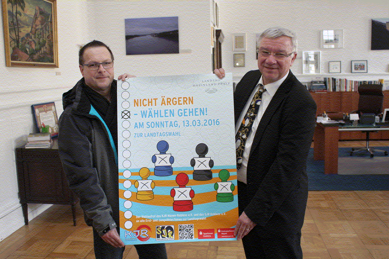 Oberbürgermeister Prof. Dr. Joachim Hofmann-Göttig (rechts im Bild) unterstützt die Aktion „Deine Stimme zählt“. Stadtjugendring Koblenz und der Kreisjugendring Mayen-Koblenz haben erneut eine Plakataktion aus der Taufe gehoben, die junge Menschen animieren will, am kommenden Sonntag wählen zu gehen. „Die Aktion der Jugendringe hat mir schon bei den letzten Wahlen gut gefallen, denn Demokratie lebt von Beteiligung“, betont der OB.