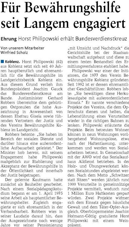 - 14.30 Uhr: Verleihung des Bundesverdienstkreuzes am Bande an Herrn Horst Philipowski durch Justizminister Robbers