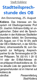 Am Donnerstag, 25. August, von 17.00 bis 19.00 Uhr, steht der OB in Metternich, in der IGS Koblenz, Johannesstraße 56, zum Gespräch zur Verfügung.