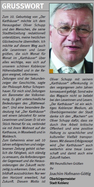 Grußwort des Koblenzer OB Hofmann-Göttig in “Die ´Elektrisch´ an Rhein, Mosel und Lahn”,