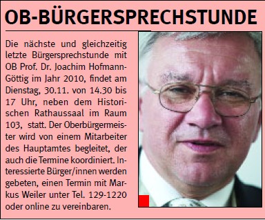 Neu: Die letzte Koblenzer Rathaus-OB-Bürgersprechstunde für 2010 wurde nochmals verlegt: Vom 30.11.2010 auf den 16.11.2010