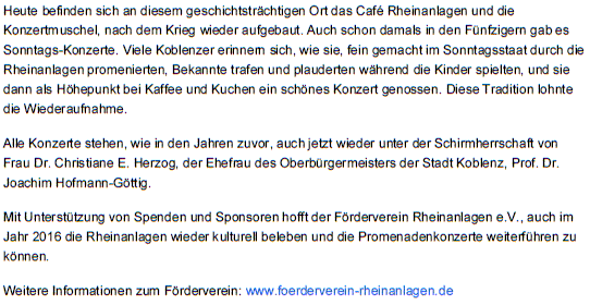 02./23.08.2015: Noch zwei Koblenzer Promenadenkonzerte des Fördervereins Rheinanlagen