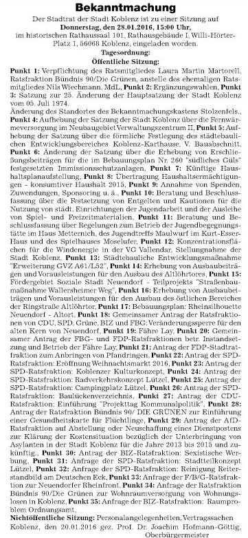 Tagesordnung der Koblenzer Stadtrats-sitzung 28.01.2016