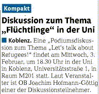 03.02.2016: Diskussion zum Thema Flücht-linge in Koblenzer Uni – OB Hofmann-Göttig auch Diskussionsteilnehmer