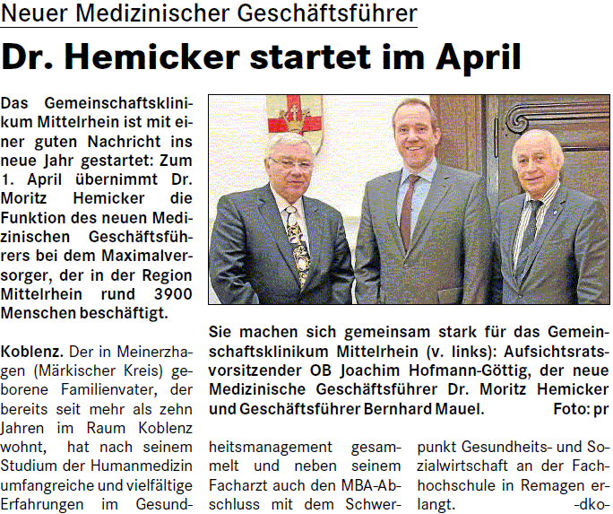 Neuer Medizinischer Geschäftsführer beim Gemeinschaftsklinikum Mittelrhein ab 01.04.2016
