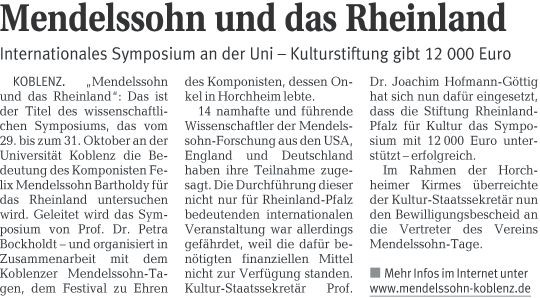 Staatssekretär Hofmann-Göttig überreicht Bewilligungsbescheid für Mendelsohn-Symposium Rhein-Zeitung 20.06.2009