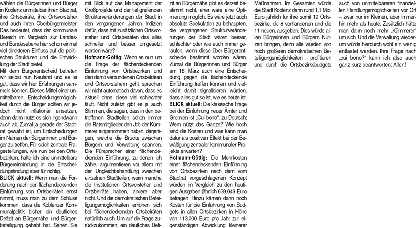 1. Koblenzer Bürgerentscheid – Flächendeck-ende Ortbezirke gewünscht? – Gespräch mit OB Hofmann-Göttig – (2) “JoHo`s Endspurt”