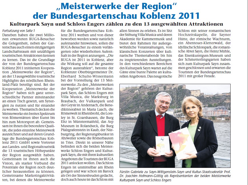 “Meisterwerke der Region” der Bundes-gartenschau Koblenz 2011: Auch Kulturpark Sayn und Schloss Engers sind dabei