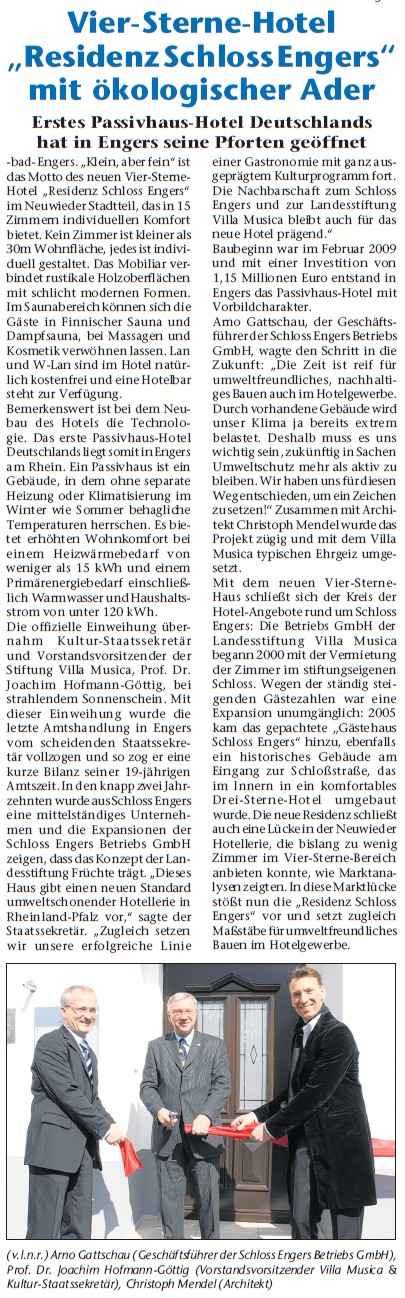 Schloss Engers: Einweihung des vier Sterne Passivhaus-Hotels als letzte “Villa-Musica-Amtshandlung” des Kulturstaatssekretärs Hofmann-Göttig vor Koblenzer OB-Amts-antritt