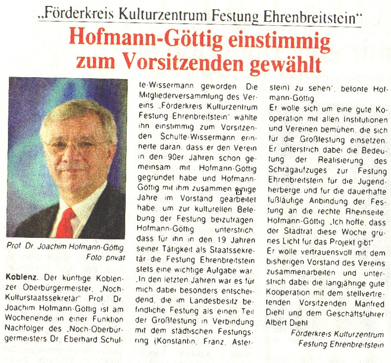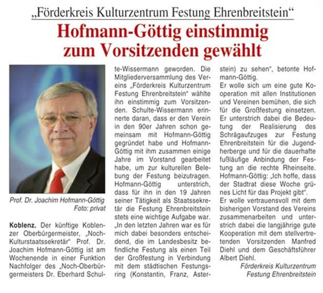 Hofmann-Göttig neuer Vorsitzender des Vereins “Förderkreis Kulturzentrum Ehrenbreitstein”