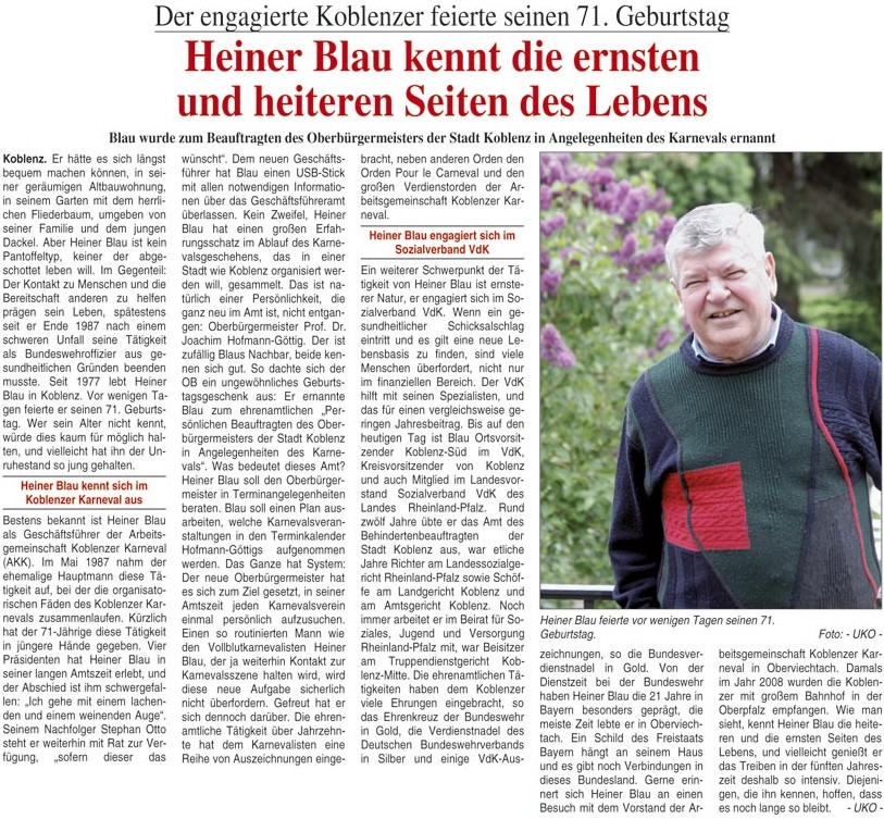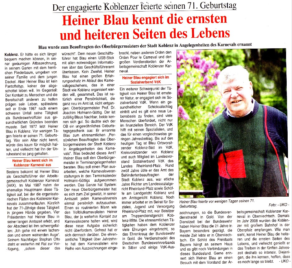 Heiner Blau zum Beauftragten in Angelegenheiten des Karnevals vom Koblenzer OB Hofmann-Göttig ernannt