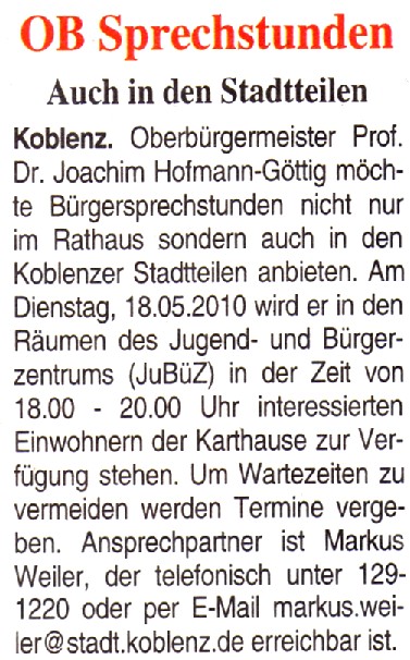 18.05.2010: OB-Stadtteil-Bürger-sprechstunde auf der Karthause