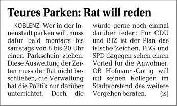 Teureres Parken in der Koblenzer Innen-stadt: Falsches Zeichen, Schutz der Anwoh-nenden oder Stärkung des Öffentlichen Nahverkehrs?