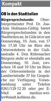 10.06.2010: Koblenzer OB Hofmann-Göttig zur Stadtteil-Bürgersprechstunde in “Güls” und in “Rübenach”