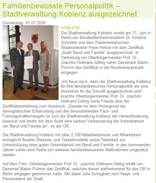 Auszeichnung für Stadtverwaltung Koblenz: Familienbewusste Personalpolitik