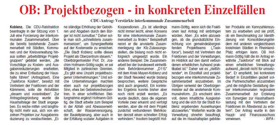 Koblenzer OB Hofmann-Göttig: Verstärkte interkommunale Zusammenarbeit, projekt-bezogen und in konlreten Fällen …