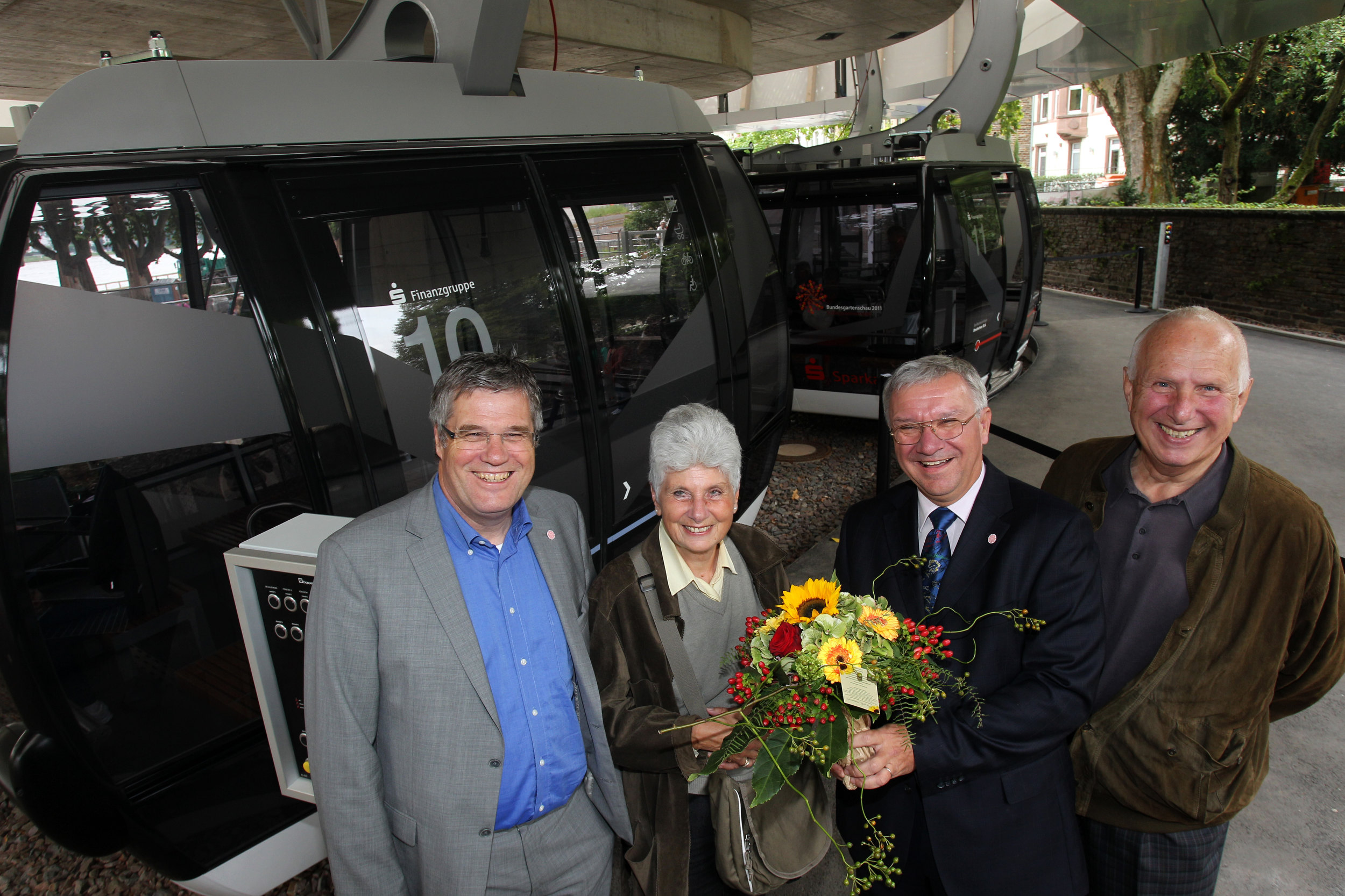 KOBLENZ (pm). Einen ganz besonderen 70. Geburtstag erlebte heute Marlies Hefele aus Bergisch-Gladbach, die ihren Jubeltag eigentlich ganz in Ruhe mit ihrem Mann Herbert in Koblenz verbringen und dabei auch mit der BUGA-Seilbahn fahren wollte. Schon hinter den Drehkreuzen der Talstation war es vorbei mit der trauten Zweisamkeit: Dort lauerten der Koblenzer Oberbürgermeister Prof. Dr. Joachim Hofmann-Göttig und BUGA-Geschäftsführer Hanspeter Faas, um sie als 111.111te Seilbahnfahrerin zu begrüßen.