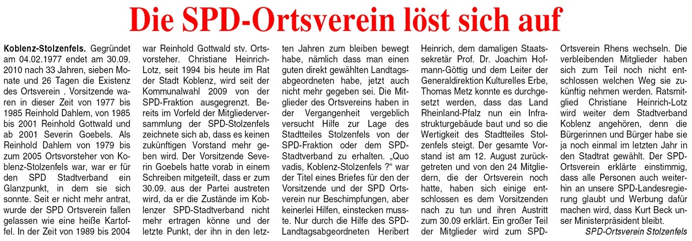 Trotz Steigerung der Wertigkeit des Koblenzer Stadtteils Stolzenfels löst sich SPD-Ortsverein auf