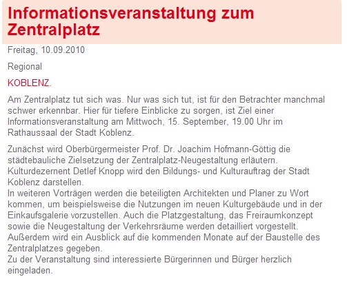 15.09.2010: Einladung zur Info-Veranstal-tung mit OB Hofmann-Göttig zum Koblenzer Zentralplatz
