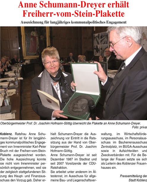 Koblenzer Ratsfrau Schumann-Dreyer erhält Freiherr-vom-Stein-Plakette aus der Hand von OB Hofmann-Göttig