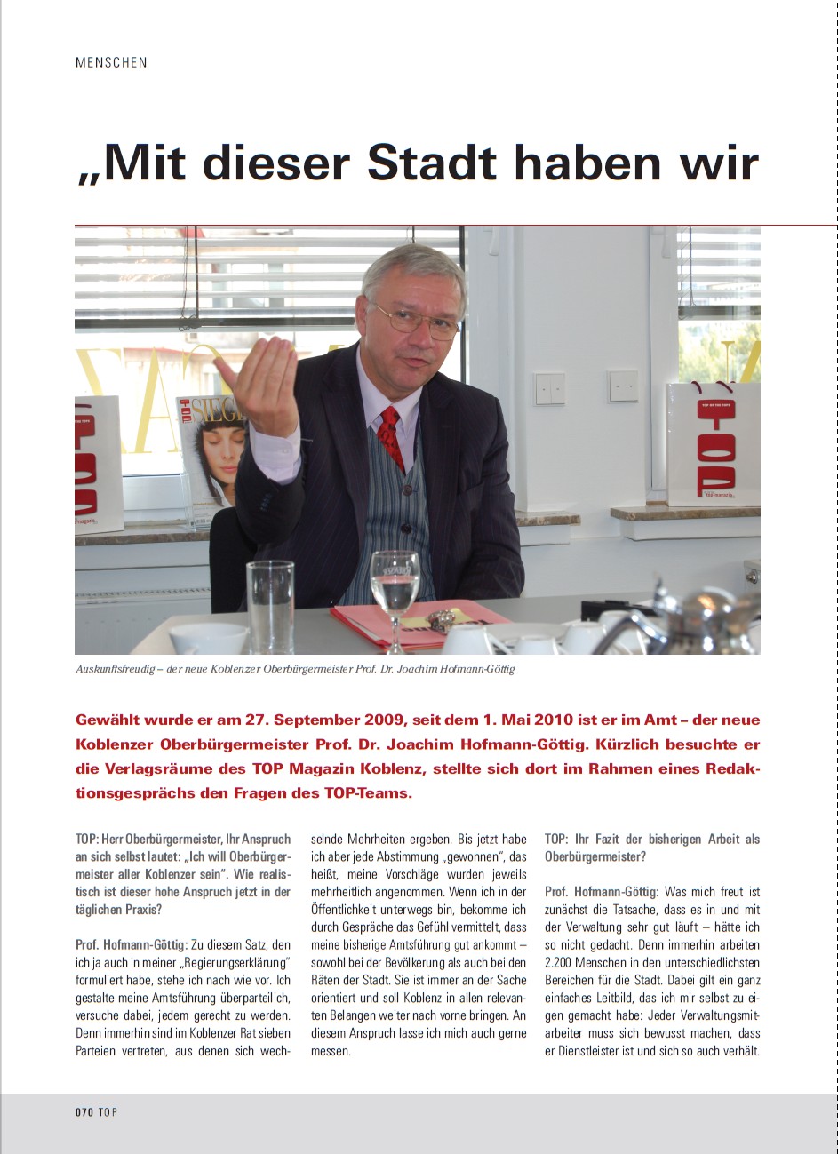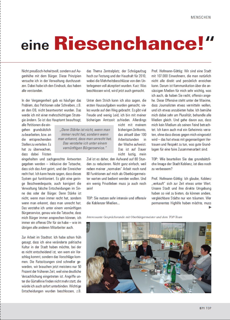 Posted in Interviews/Gespräche JoHo, Medien/Presse zu JoHo by joho Keine KommentareTop Magazin Koblenz, Ausgabe 4, Winter 2010, Deckblatt, Inhaltsverzeichnis und S.70-72