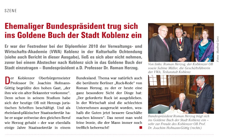 Alt-Bundespräsident Roman Herzog bei OB Hofmann-Göttig mit Eintrag ins Goldene Buch der Stadt Koblenz