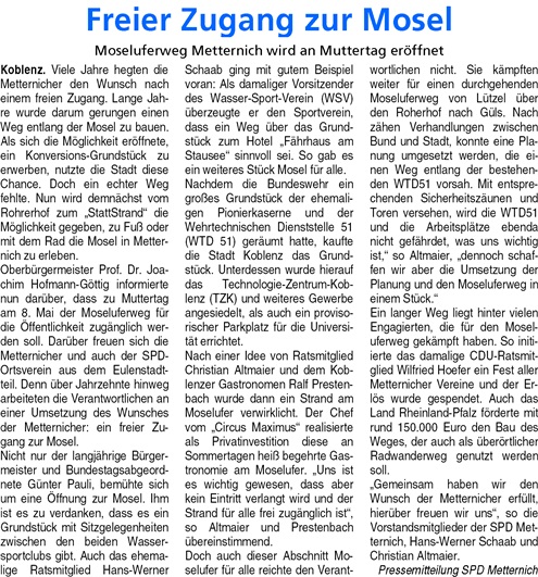 08.05.2011: Koblenzer Moseluferweg im Stadtteil Metternich wird freigegeben