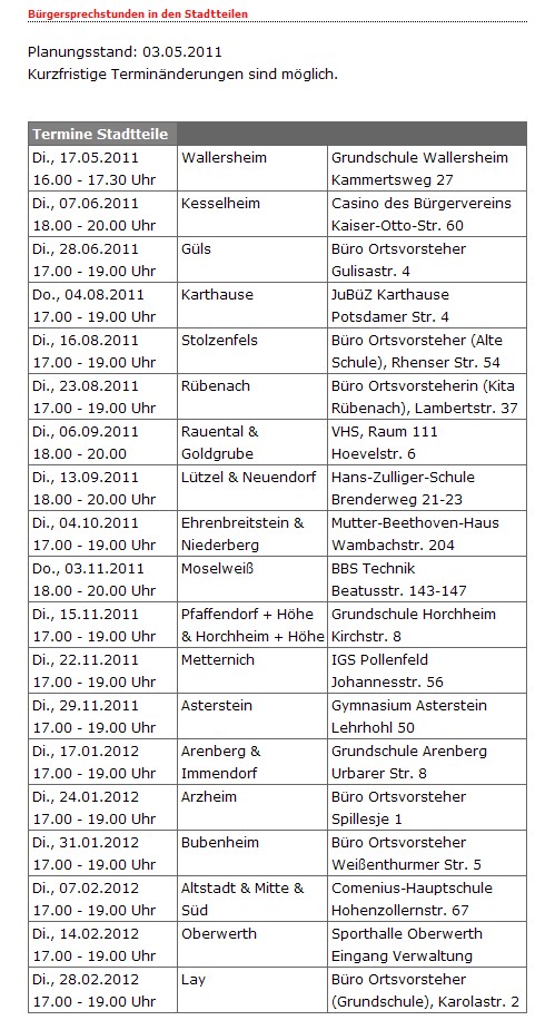 2011/2012: Terminübersicht der Koblenzer Stadtteil-Bürgersprechstunden von OB Hofmnn-Göttig
