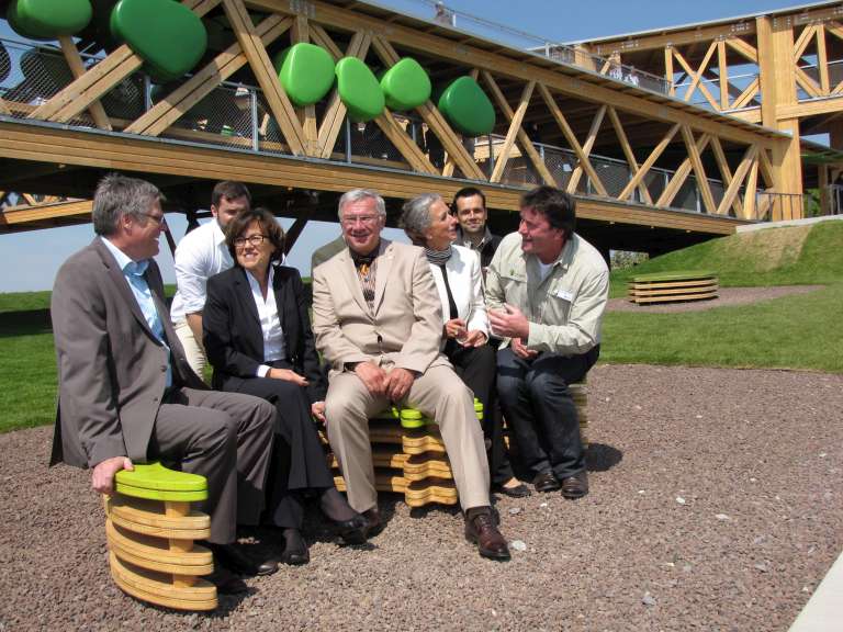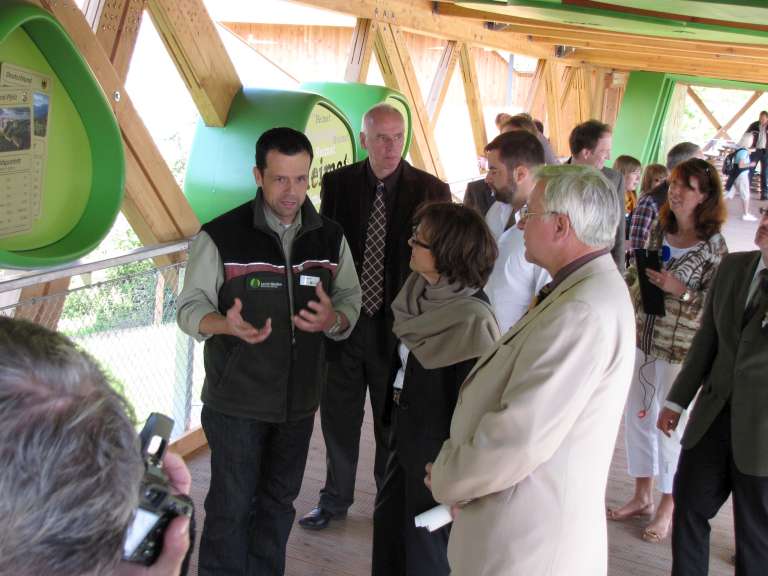 Heute besichtigte Umweltministerin Margit Conrad das Bauwerk mit dem Ausstellungsbeitrag „Wald im Wandel. Das Gebäude wurde von dem Architekten Daniel Dethier entworfen. Das Baumaterial, etwa 150 Kubikmeter Holz, stammt aus heimischer, nachhaltiger Forstwirtschaft.